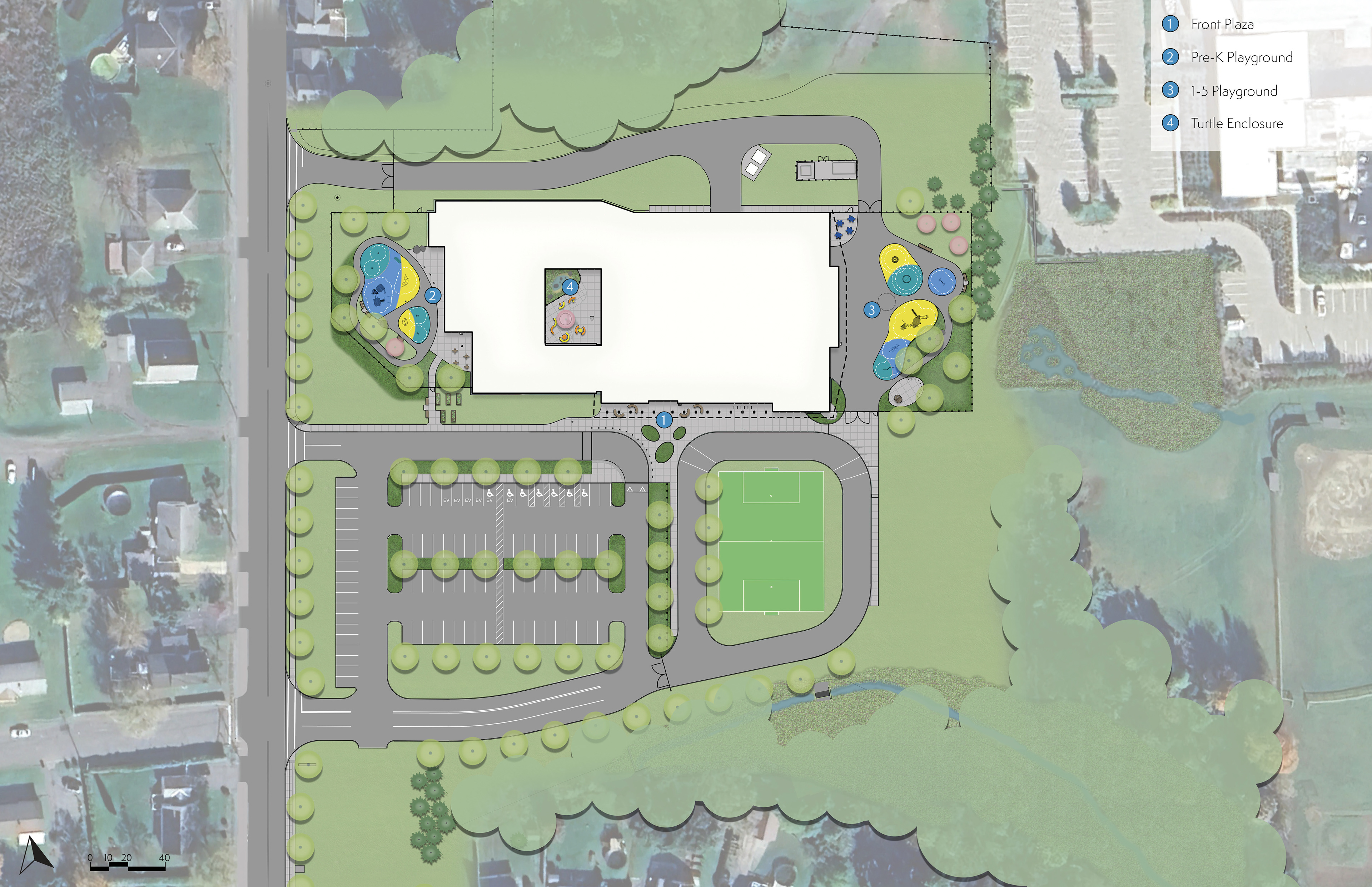 Project with Studio2112 Landscape Architects. New elementary school and landscape design through the Massachusetts School Building Authority (MSBA) in North Adams, Massachusetts. Notable site elements include: Pre-k and 1-5 playgrounds, interior courtyard with turtle enclosure, and front plaza with seating.