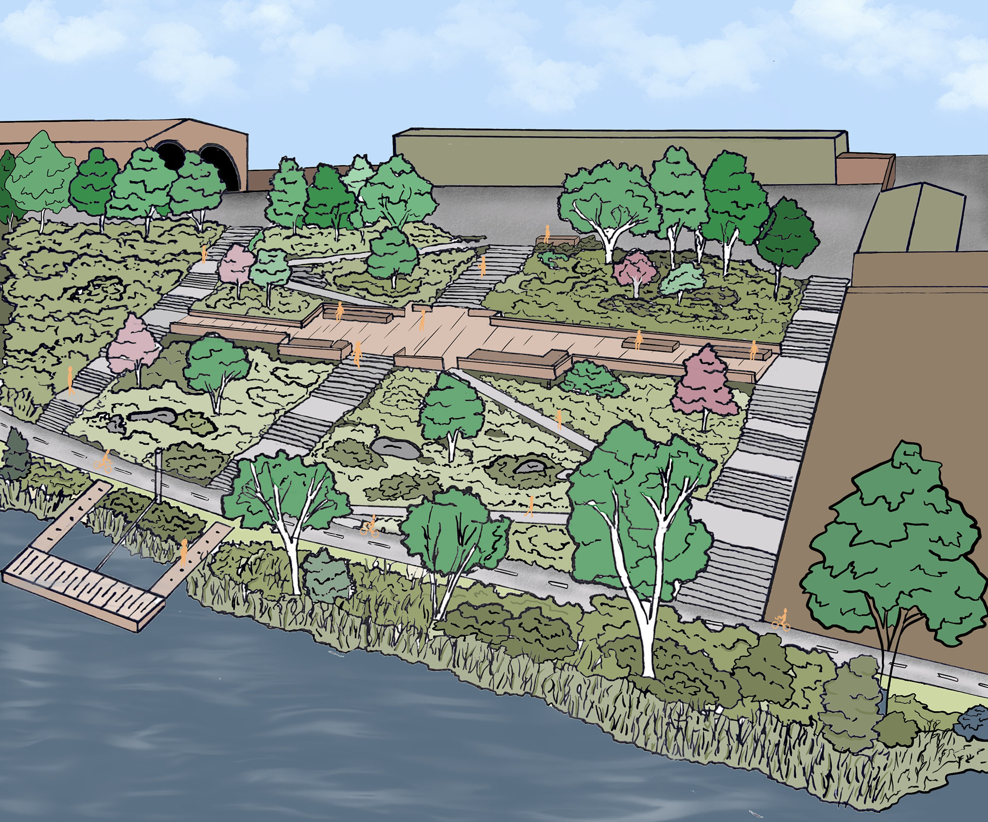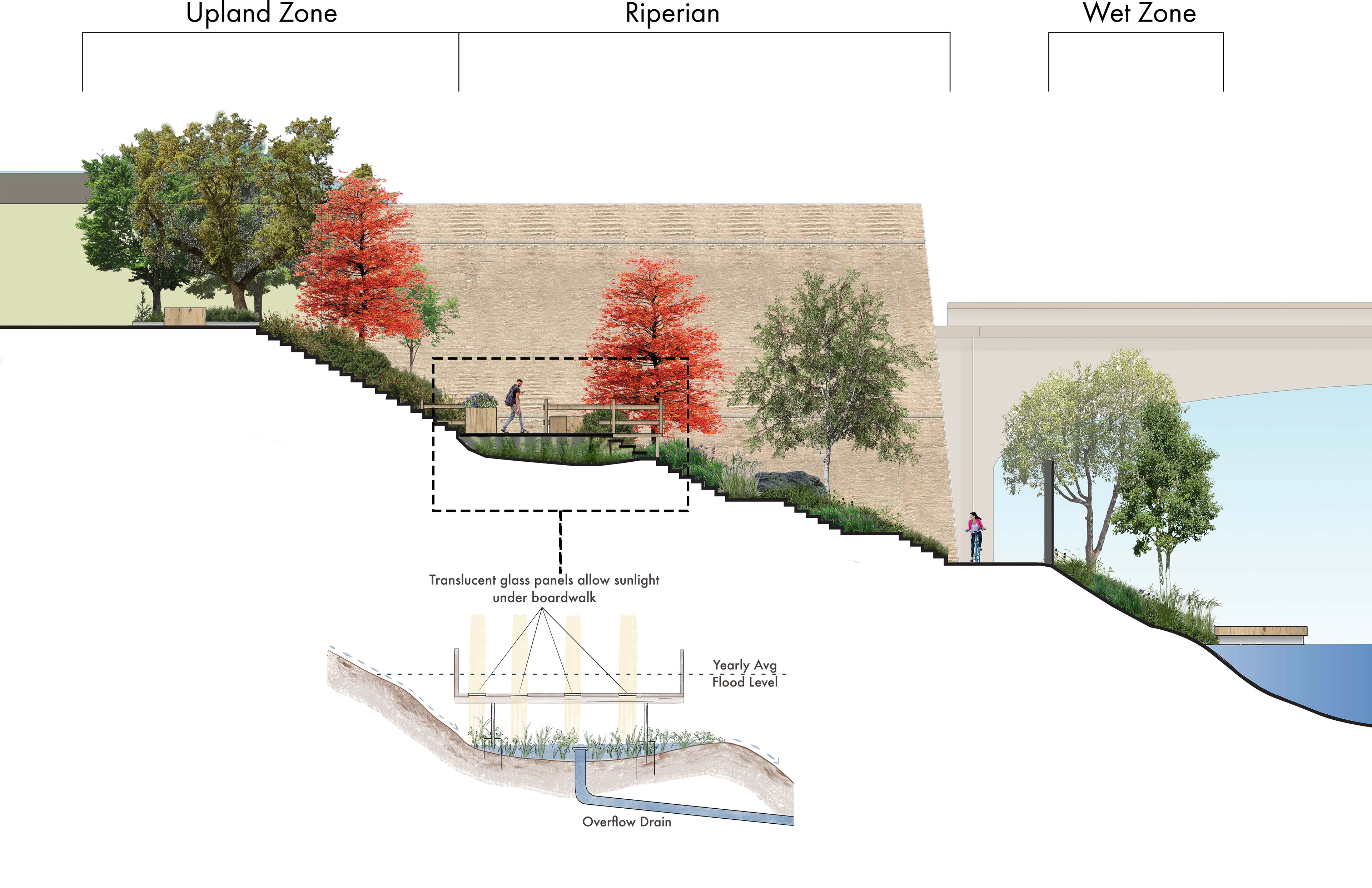 Pantheon Institute Architecture Studio Project - Rome, Italy This concept involved a tiered system of native riparian edge plant communities along a walk-able slope as an alternative to handle annual floods and runoff. It provides an ADA accessible connection to the riverside edge with a midway boardwalk for gathering and lookout space.