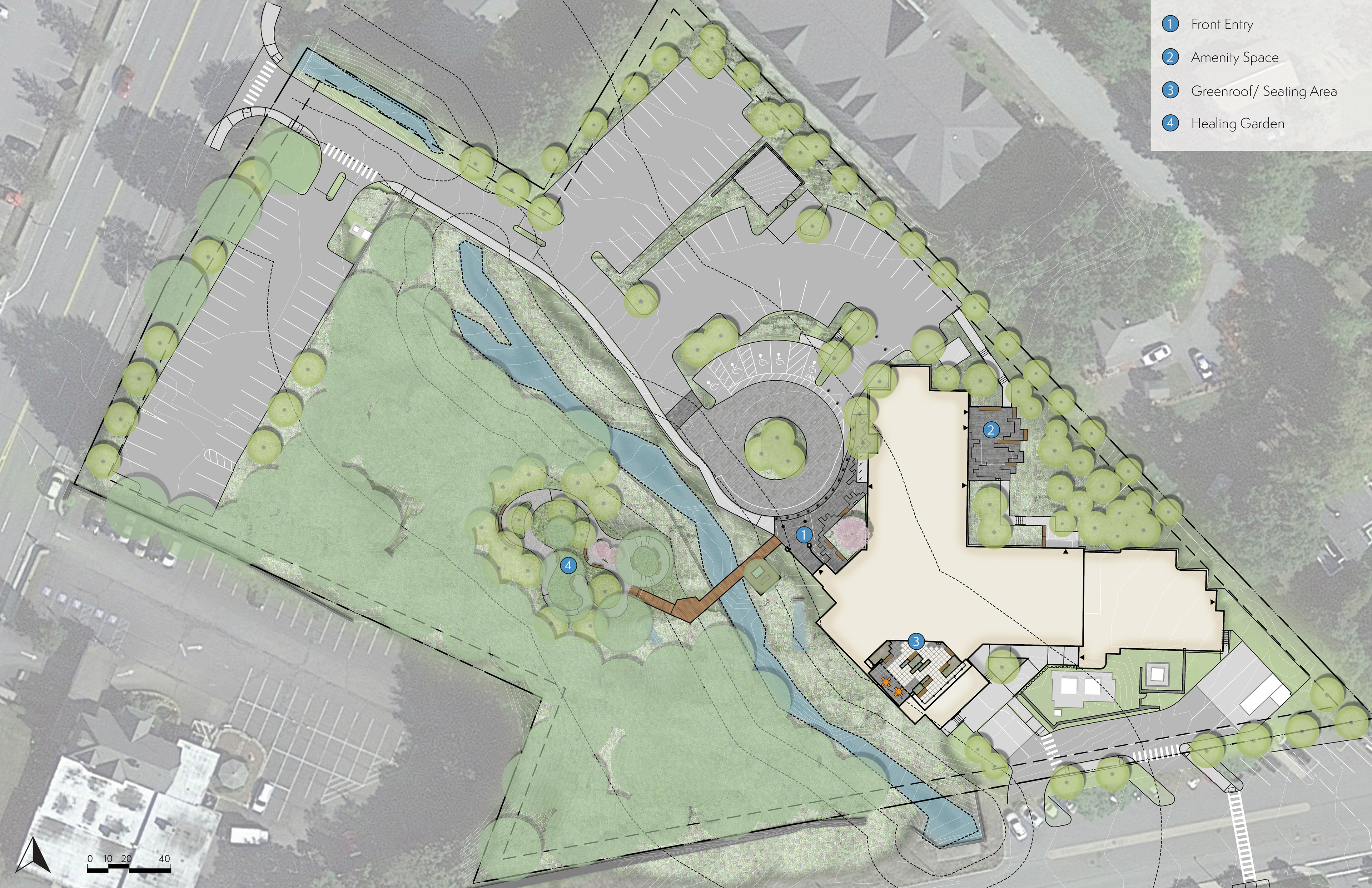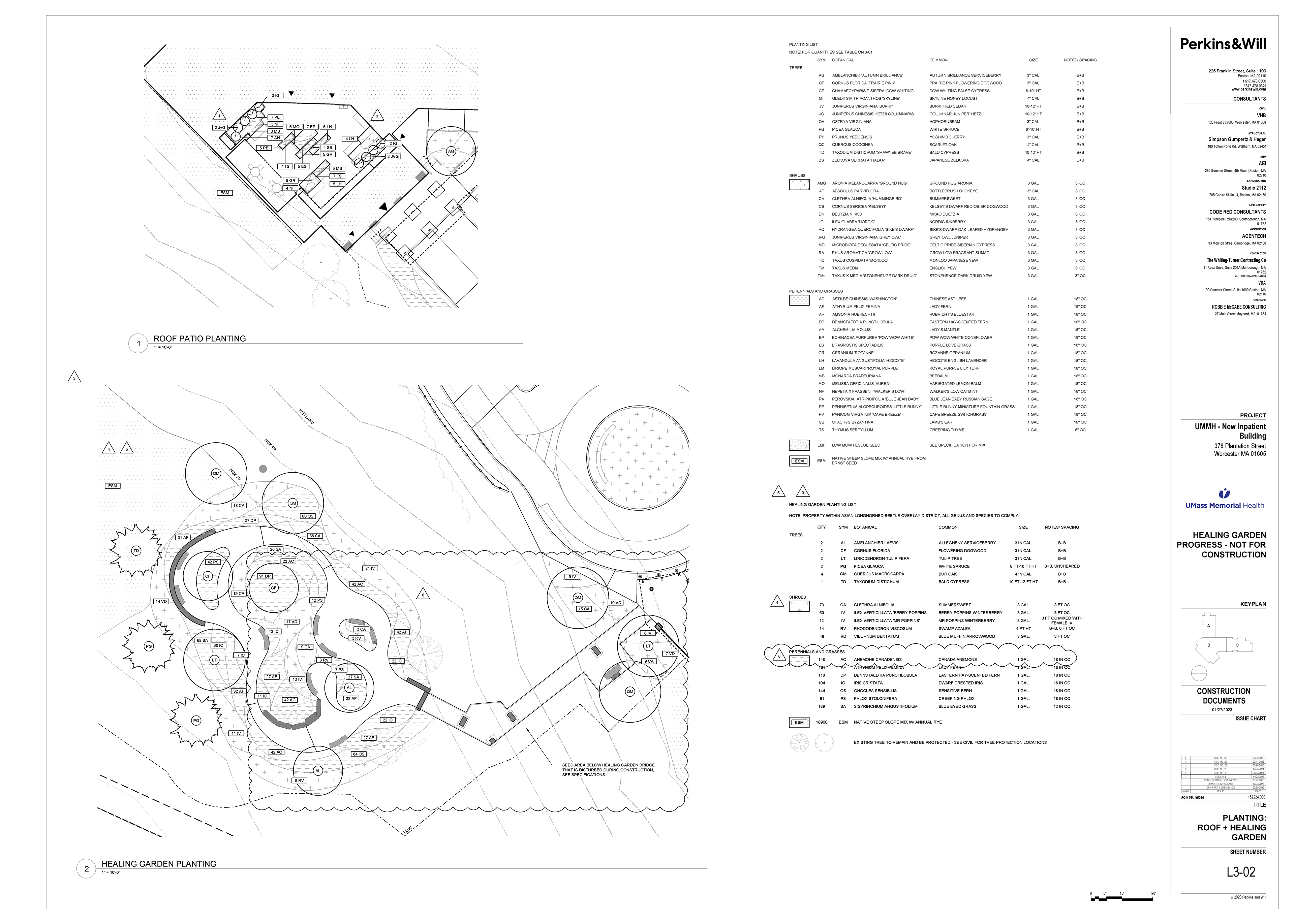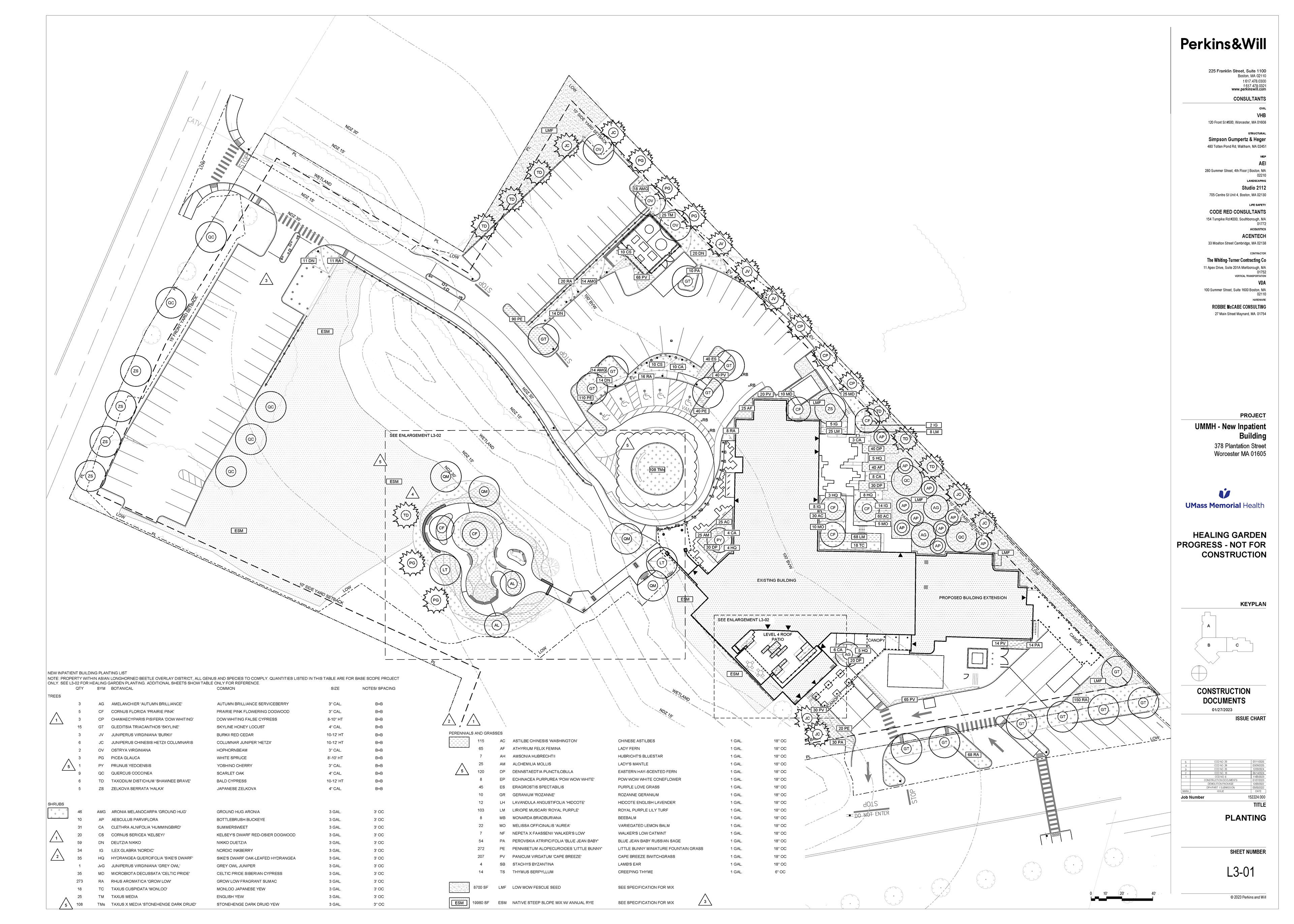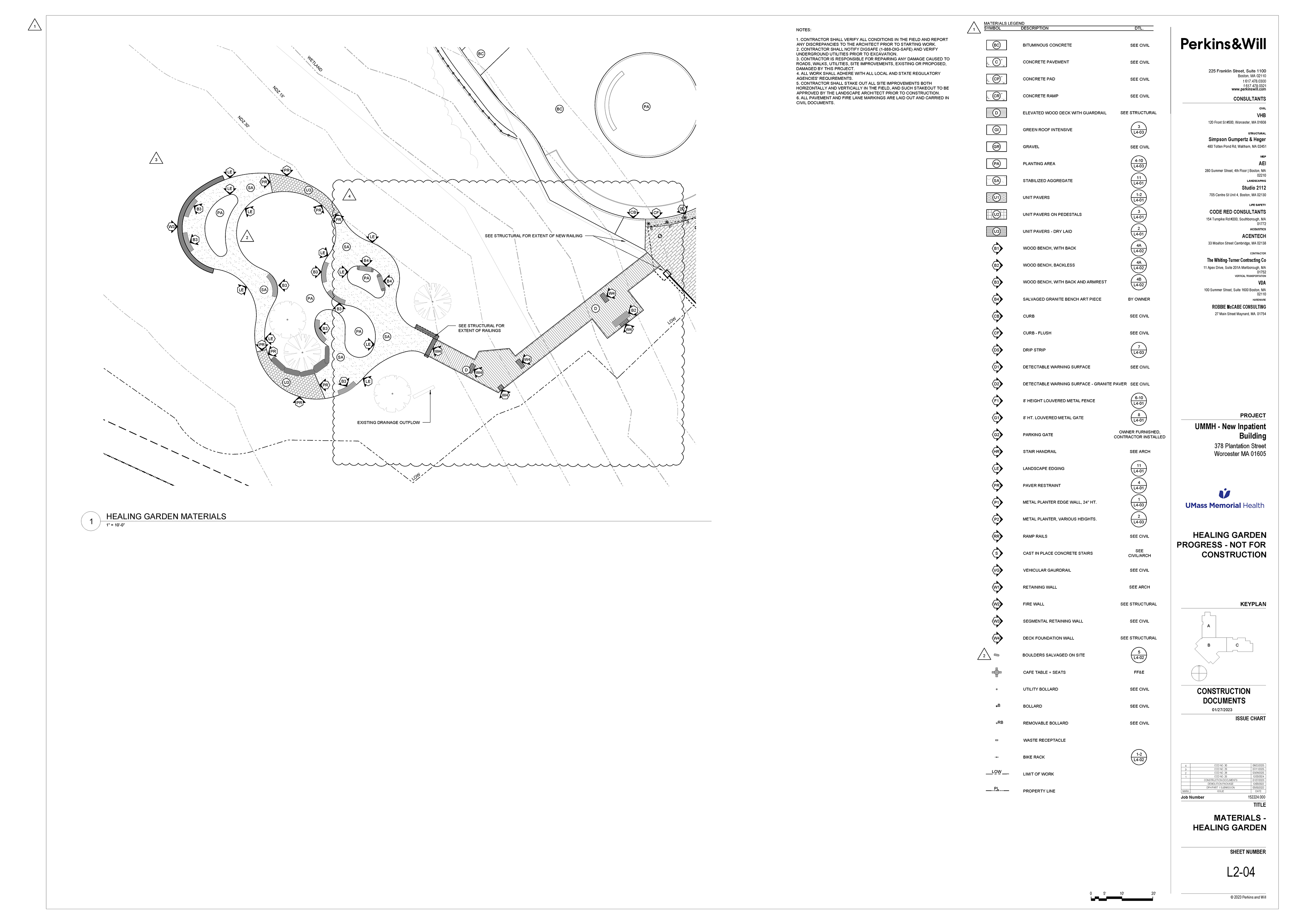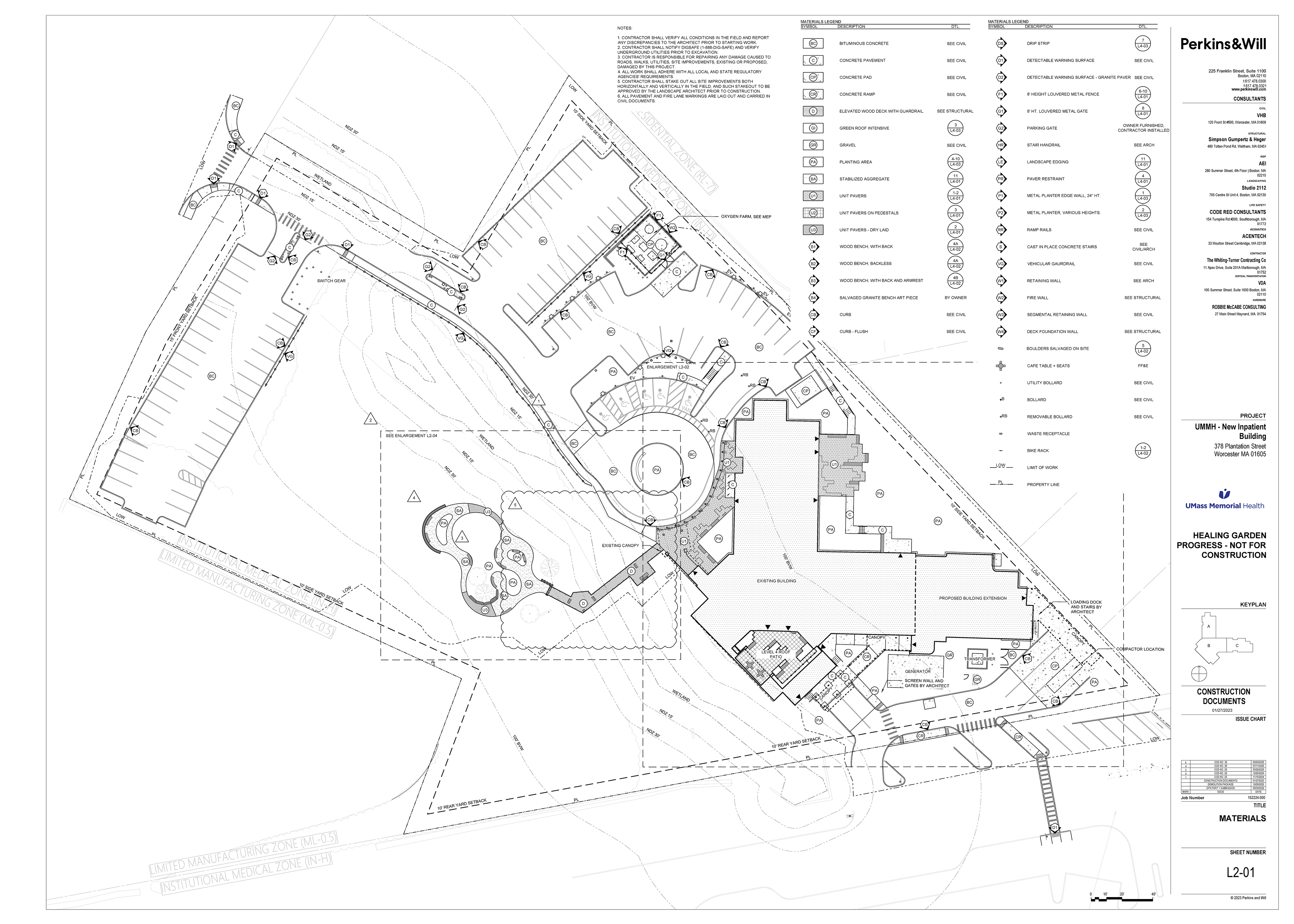 Project with Studio2112 Landscape Architects. Landscape design for new inpatient care facility in Worcester, Massachusetts. Site amenity spaces include: roof top garden, patio and seating areas, and healing garden with boardwalk access.